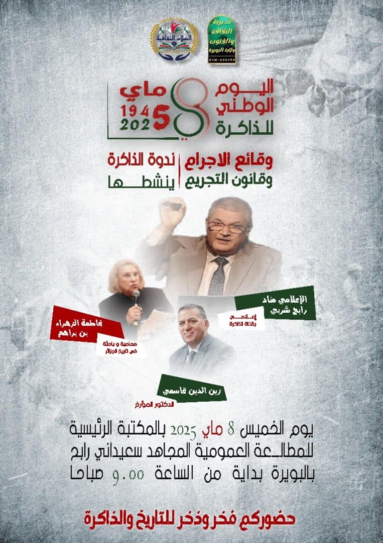 في سياق متصل، نظمت جمعية نشاطات السلام الثقافية ندوة تاريخية في نفس الموضوع حول اليوم الوطني للذاكرة ظهيرة الثلاثاء بالمركز الثقافي رخوان عيسى بالأخضرية نشّطها الباحث في التاريخ أحمد وقاد والأديب القاص المتخصص في التاريخ عمر دفاف، وتم خلالها منح وسام الذاكرة للمجاهد بلعيد منان ابن بلدية بوكرام المجاهدة، بالإضافة إلى تكريم الإعلامي أحمد دهنيز بمناسبة اليوم الوطني لحرية الصحافة 3 ماي، بوسام “الإعلامي المتميّز” نظير مسيرته الإعلامية الحافلة بالعطاء والتميّز، وباعتباره أيضا واحدا من صنّاع المشهد الثقافي والمسرحي كاتبا ومخرجا على الصعيدين المحلي والوطني.