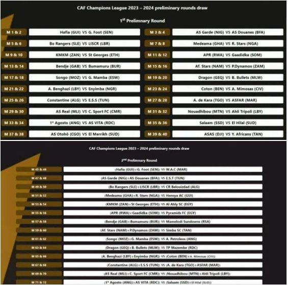 في حين، سيكون ممثل الجزائري الثاني في هذه المنافسة، جمعية الشلف المتوج بكأس الجزائر 2023، على موعد مع بندل من نيجيريا في الدور الاول التمهيدي، علما ان الذهاب سيقام في نيجيريا والاياب بالجزائر.