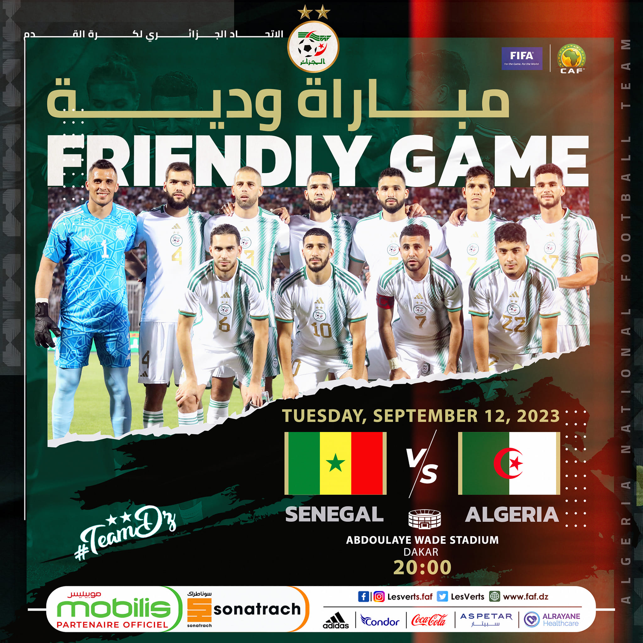 وأوضحت الفاف في بيان نشرته عبر موقعها الرسمي على شبكة الانترنت :” ان الاتحاديتين الجزائرية ونظيرتها السنغالية قد اتفقتا على تنظيم مقابلة ودية ستجمع بين منتخبي البلدين يوم الثلاثاء 12 سبتمبر المقبل بملعب عبدولاي واد بداكار بداية من الساعة ال00ر19 بتوقيت غرينيتش / 00ر20 بتوقيت الجزائر).
