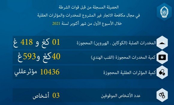 كما تم في ذات الإطار، حجز “01 كغ و418 غ من مادة الكوكايين” و ” 40 كغ و593 غ من مادة الكيف المعالج” علاوة على 10436 قرص مهلوس”.