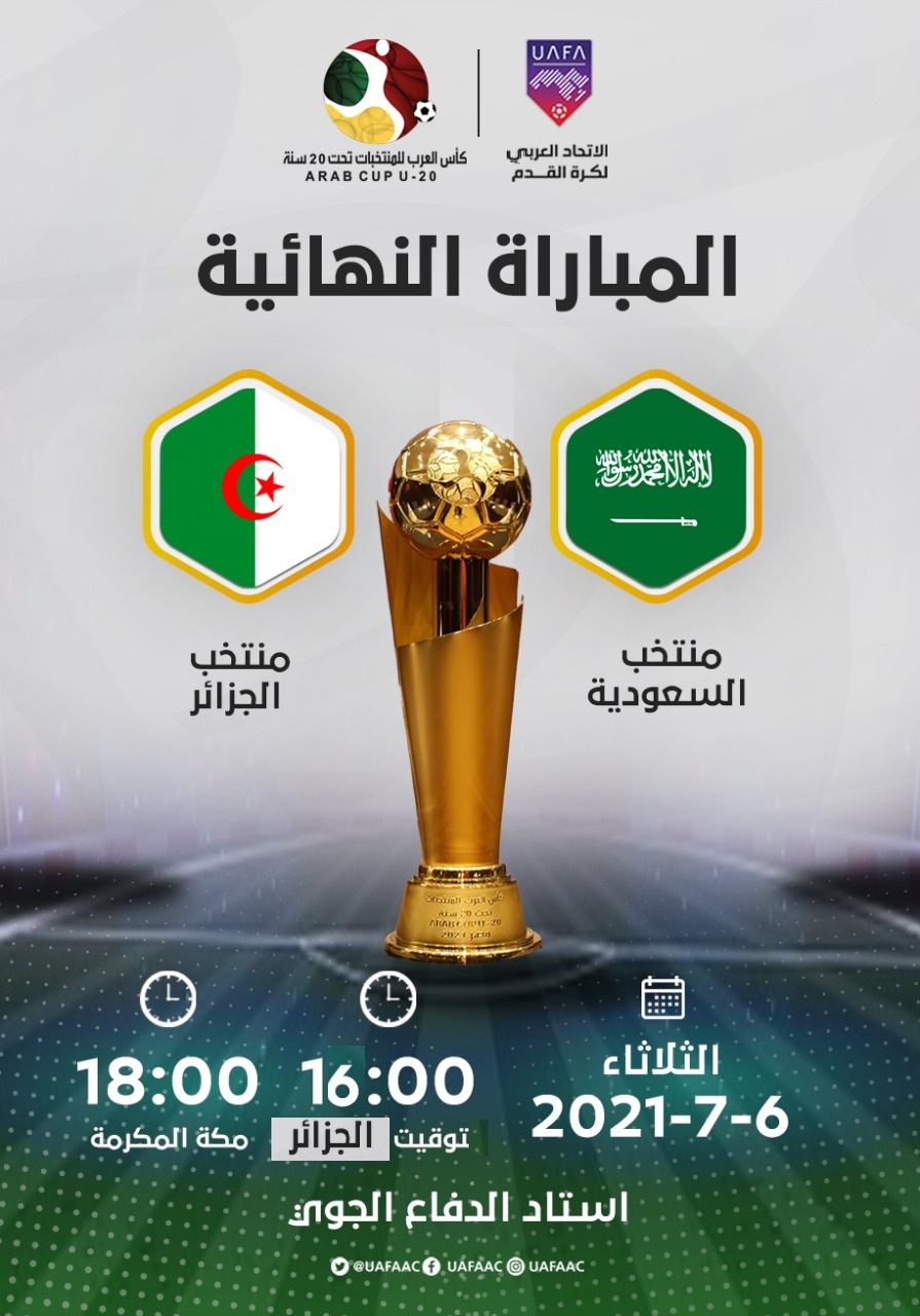 جدير بالذكر، أن الاتحاد العربي لكرة القدم، قرر تغيير توقيت ومكان إجراء نهائي كأس العرب لمنتخبات أقل من 20 سنة الذي سيجمع بين المنتخب الوطني ونظيره السعودي هذا الثلاثاء.