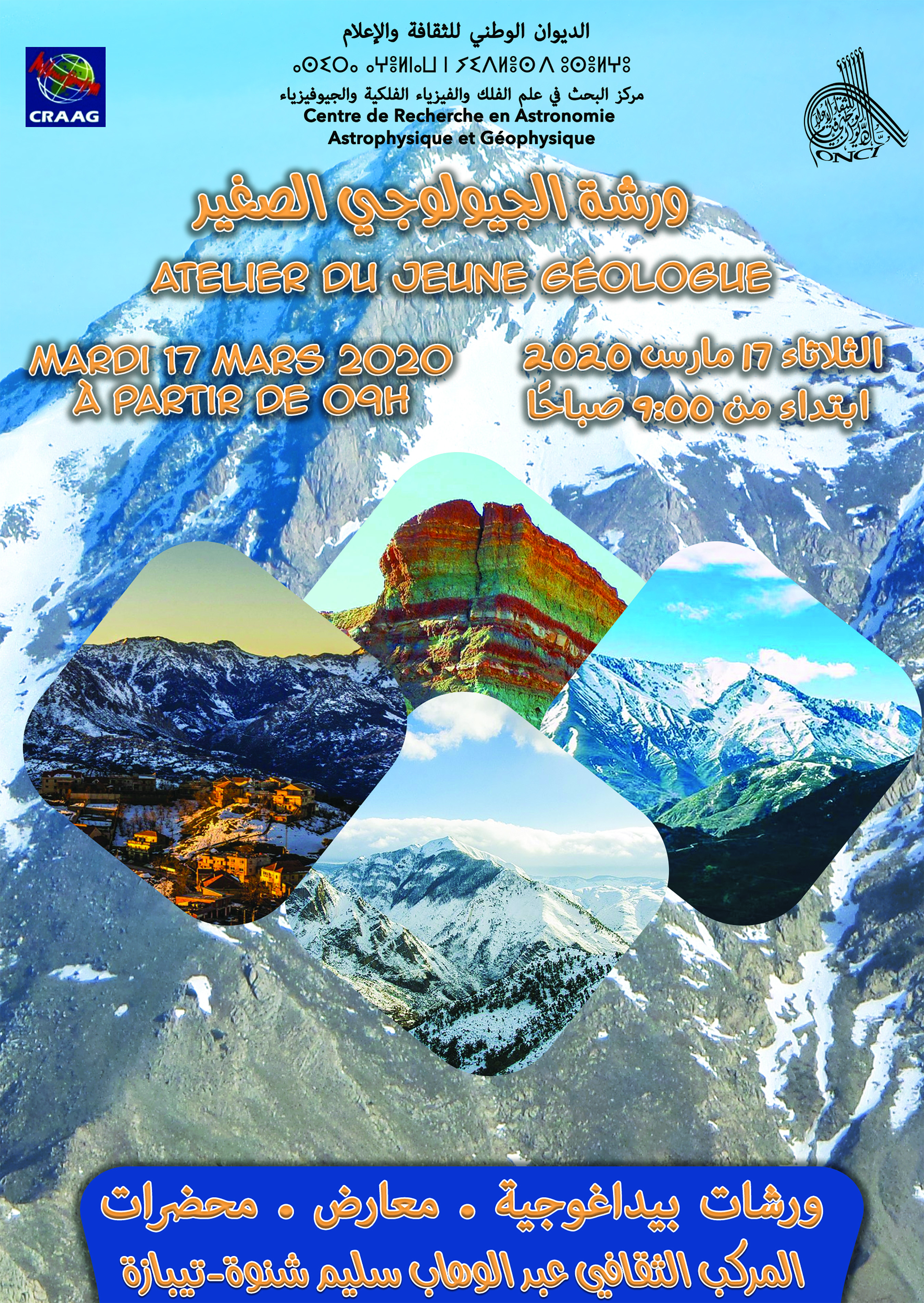ينظم الديوان الوطني للثقافة والإعلام بالتنسيق مع مركز الأبحاث في الفيزياء الفلكية والجيوفيزياء، يوم الثلاثاء 17 مارس، يومًا علميًا بالمركب الثقافي عبد الوهاب سليم شنوة تيبازة حول اكتشاف الجيولوجيا لأطفال المدارس والثانويات “ورشة الجيولوجي الصغير “.
