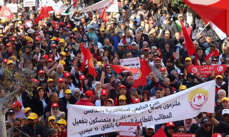 وخرج الآلاف من أنصار الاتحاد العام التونسي للشغل، أحد أقوى القوى السياسية في تونس ، إلى شوارع ثماني مدن يوم السبت للاحتجاج على سياسات سعيد، واتهموه بمحاولة خنق الحريات الأساسية بما في ذلك الحقوق النقابية. وقالت إستر لينش ، مخاطبة الآلاف في احتجاج صفاقس، إنها جاءت لنقل رسالة دعم من 45 مليون نقابي أوروبي ودعت إلى الإفراج الفوري عن المسؤولين النقابيين المحتجزين.