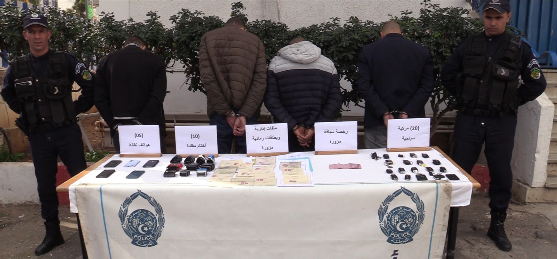 مواصله للتحريات التي باشرتها فرقه الشرطة القضائية لأمن المقاطعة الإدارية حسين داي، أفضت العملية إلى توقيف أربعه أشخاص مشتبه فيهم مسبوقين قضائيا تتراوح أعمارهم ما بين 38 و56 سنه، تبين أنهم ينشطون ضمن شبكه إجرامية مختصة في سرقه المركبات وتزوير وثائقها الإدارية ليتم تنفيذ إذن بالتفتيش وتمديد الاختصاص أين تمكنت الفرقة من ضبط واسترجاع 20 مركبه سياحية، 10 أختام مقلدة ورخصة سياقة مزورة، خمس هواتف نقاله، ملفات إدارية مزوره خاصة بالمركبات.