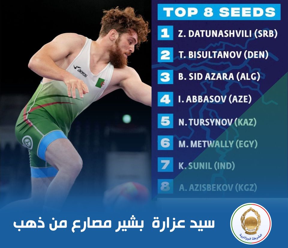 هنأت المديرية العامة للأمن الوطني مصارعها سيد عزارة بشير التابع للجمعية الرياضية للأمن الوطني، إثر تسجيل اسمه من ذهب ضمن قائمة أقوى المصارعين عالميا في رياضة المصارعة الإغريقو- رومانية، باحتلاله المركز الثالث في التصنيف العالمي لفئة 87 كلغ. للإشارة، تحصل المصارع سيد عزارة بشير المشارك مع المنتخب الوطني في دورة ألعاب البحر الأبيض المتوسط وهران 2022 على الميدالية الذهبية.
