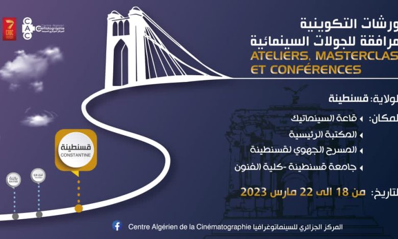 تحتضن ولاية قسنطينة بداية من يوم السبت المقبل و الى غاية 22 مارس الجاري، الجولة الرابعة للورشات التكوينية الخاصة بالفن السابع، والتي ينظمها المركز الجزائري للسينيماتوغرافيا والمركز الجزائري لتطوير السينما بالتنسيق مع مديرية الثقافة و جامعة قسنطينة، ويستفيد منها متربصون من تكوين نظري وتطبيقي يقدم مفاتيح لمبادئ تعلم السينما.