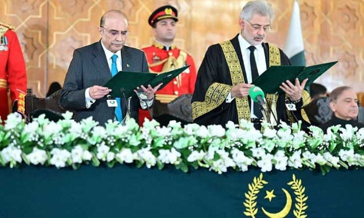 أدى آصف علي زرداري، أرمل رئيسة الوزراء الباكستانية السابقة، بينظير بوتو، اليمين الدستورية، ليصبح الرئيس الـ14 للبلاد الأحد. وشهد رئيس المحكمة العليا الباكستانية، كازي فايز عيسي مراسم أداء اليمين في القصر الرئاسي في إسلام آباد، بحضور زعماء مدنيين وعسكريين.