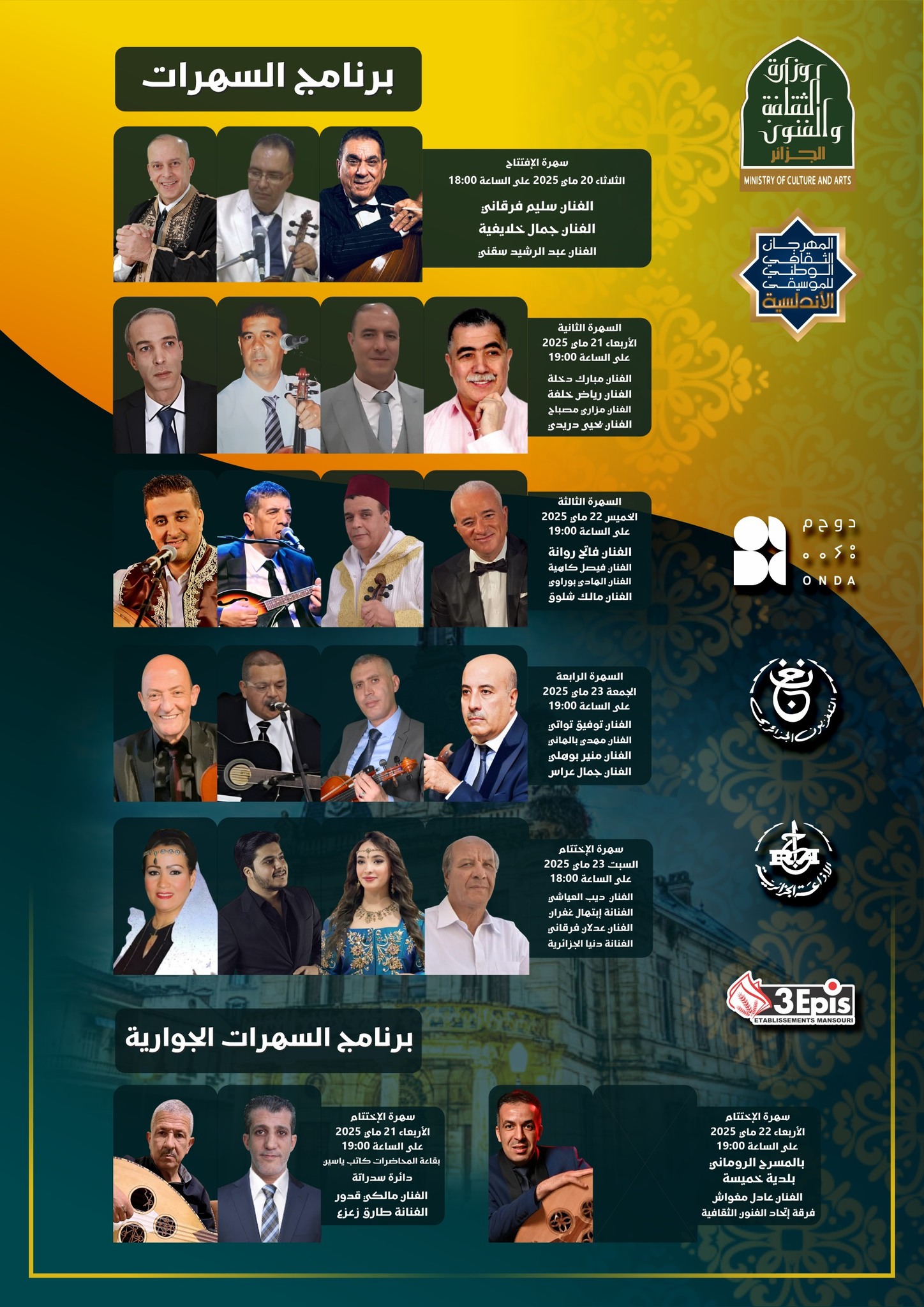 ستشهد دار الثقافة الطاهر وطار خمس أمسيات ساهرة ابتداءً من الساعة 19 سا، يحييها ثمانية عشر فناناً من أبرز رواد الموسيقى الأندلسية، قادمين من ست ولايات هي سوق أهراس، عنابة، تلمسان، سكيكدة، ميلة وقسنطينة كما ستُقام أمسيتين جواريتين بقاعة المحاضرات كاتب ياسين بدائرة سدراتة، بمشاركة ثلاثة فنانين وفرقة موسيقية من ولاية قالمة.