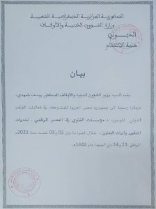 يقوم، وزير الشؤون الدينية والأوقاف، يوسف بلمهدي، بزيارة رسمية، إلى جمهورية مصر، للمشاركة في فعاليات المؤتمر الدولي الموسوم ب ” مؤسسات الفتوى في العصر الرقمي”.