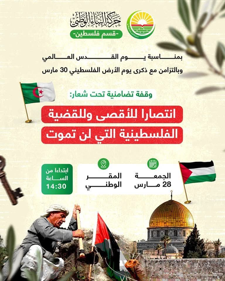نظمت حركة البناء الوطني, أول أمس, وقفة تضامنية مع الشعب الفلسطيني الصامد في وجه غطرسة الاحتلال الصهيوني وسياساته القمعية, وذلك بمناسبة الذكرى المزدوجة ليوم الأرض الذي يصادف 30 مارس من كل سنة واليوم العالمي للقدس الذي يتزامن مع الجمعة الأخيرة من شهر رمضان الكريم.