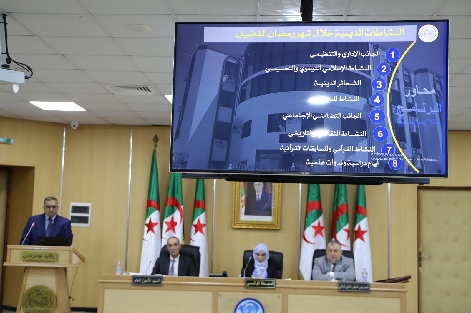 مواصلة لأشغال المجلس التنفيذي الولائي المنعقد أول أمس برئاسة والي ولاية بومرداس السيدة فوزية نعامة رفقة رئيس المجلس الشعبي الولائي، يوسف طلاش، قدم مدير الشؤون الدينية والأوقاف لولاية بومرداس بعرض شامل حول برنامج نشاطات قطاعه خلال الشهر الفضيل من الجانب الإداري والتنظيمي إلى الجانب الإعلامي التحسيسي والتوعوي، ثم النشاطات المسجدية والنشاطات الثقافية وصولا إلى المسابقات القرآنية والأيام الدراسية والندوات العلمية بحيث تمت تهيئة المساجد وقاعات الصلاة بالتنسيق مع البلديات والدوائر ومؤسسة مادينات.