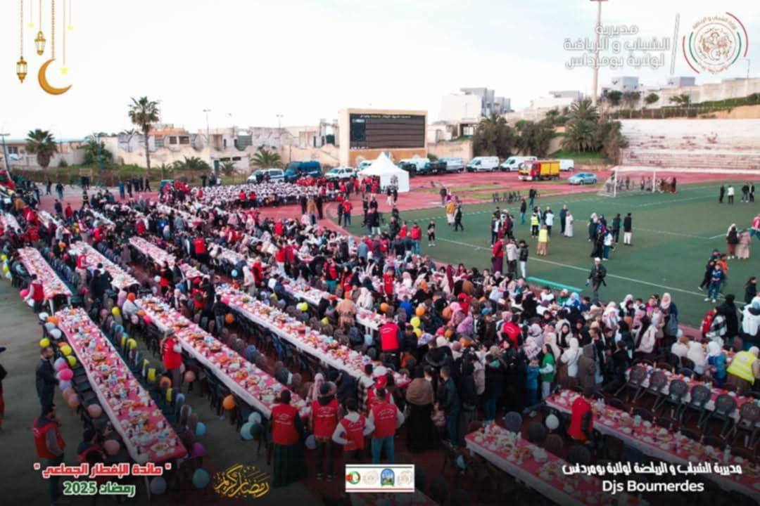 نظمت ولاية بومرداس، الجمعة، مائدة إفطار جماعي لفائدة زهاء 4 ألاف من الأطفال الأيتام وذوي الهمم وعائلاتهم وعمال النظافة القاطنين بالولاية، في جواحتفالي وتضامني وتنظيم جيد. وعرفت هذه التظاهرة التضامنية، التي نظمت بالملعب الأولمبي الجيلالي بونعامة بمدينة بومرداس، حضور وزير الشباب، المكلف بالمجلس الأعلى للشباب، مصطفى حيداوي، ووالي الولاية، فوزية نعامة، والسلطات الأمنية والمدنية المحلية وممثلي المجتمع المدني ومختلف فئات المجتمع عبر الولاية.