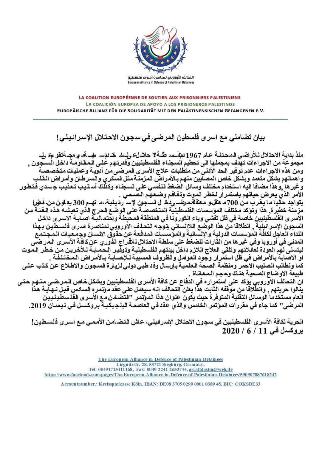 كما ونطالب الصليب الاحمر ومنظمة الصحة العالمية بإرسال وفد طبي دولي لزيارة السجون والاطلاع عن كثب على طبيعة الاوضاع الصحية هناك وحجم المعاناة . ان التحالف الاوروبي يؤكد على استمراره في الدفاع عن كافة الأسرى الفلسطينيين وبشكل خاص المرضى منهم حتى ينالوا حريتهم , وانطلاقا من موقفه الثابت هذا يعلن التحالف انه سيعمل على عقد مؤتمره السادس قبل نهاية هذا العام مستخدما الوسائل التقنية المتوفرة حيث يكون عنوان هذا المؤتمر “التضامن مع الأسرى الفلسطينيين المرضى” كما جاء في مقررات المؤتمر الخامس والذي عقد في العاصمة البلجيكية بروكسل في نيسان 2019. الحرية لكافة الأسرى الفلسطينيين في سجون الاحتلال الإسرائيلي، عاش التضامن الأممي مع اسرى فلسطين