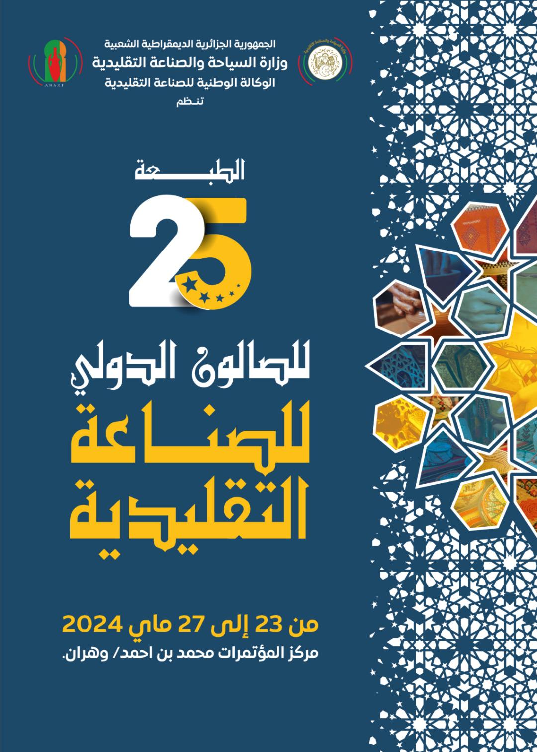 ينتظر أن تنظم الطبعة الخامسة والعشرون “25” للصالون الدولي للصناعة التقليدية في الفترة الممتدة من 23 إلى 27 ماي 2024، بمركز المؤتمرات “محمد بن أحمد” بولاية وهران.
