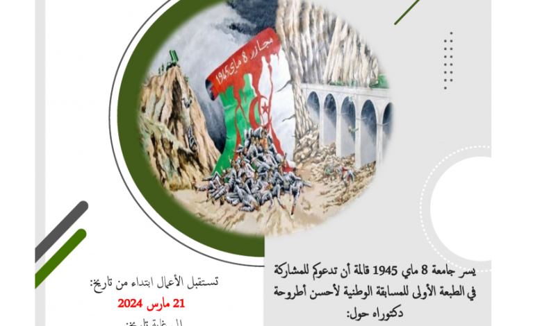 دعت جامعة 8 ماي 1945 قالمة، الباحثين للمشاركة في الطبعة الأولى من المسابقة الوطنية لأحسن أطروحة دكتوراه حول الجرائم والإبادة الجماعية في الذاكرة الوطنية: 1830- 1962، تزامنا وحلول الذكرى الـ 79 لمجاز 8 ماي 1945.
