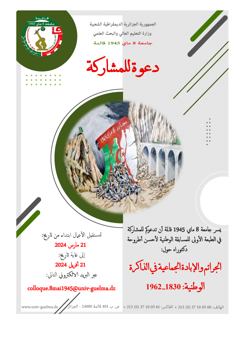 دعت جامعة 8 ماي 1945 قالمة، الباحثين للمشاركة في الطبعة الأولى من المسابقة الوطنية لأحسن أطروحة دكتوراه حول الجرائم والإبادة الجماعية في الذاكرة الوطنية: 1830- 1962، تزامنا وحلول الذكرى الـ 79 لمجاز 8 ماي 1945.