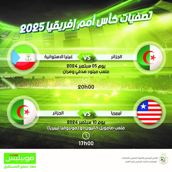 يشجع المتعامل العمومي للهاتف النقال “موبيليس” الراعي الرسمي والشريك الحصري للمنتخبات الوطنية والإتحاد الجزائري لكرة القدم، الخضر عشية مبارياته الرسمية تحسبا للجولتين الأولى والثانية من تصفيات كأس أمم أفريقيا “كان 2025” في نسختها الخامسة والثلاثين، المقررة بالمغرب من 21 ديسمبر 2025 إلى 18 جانفي 2026.
