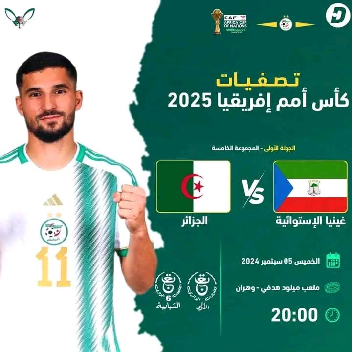 يدشن المنتخب الوطني الجزائري حملة التصفيات المؤهلة إلى نهائيات كأس إفريقيا للأمم-2025 ,بمواجهة غينيا الاستوائية, سهرة اليوم الخميس (00ر20) بملعب ميلود هدفي- بوهران, في إطار الجولة الأولى عن المجموعة الخامسة, وكله عزم على تحقيق انطلاقة موفقة لتعبيد الطريق نحو النهائيات.