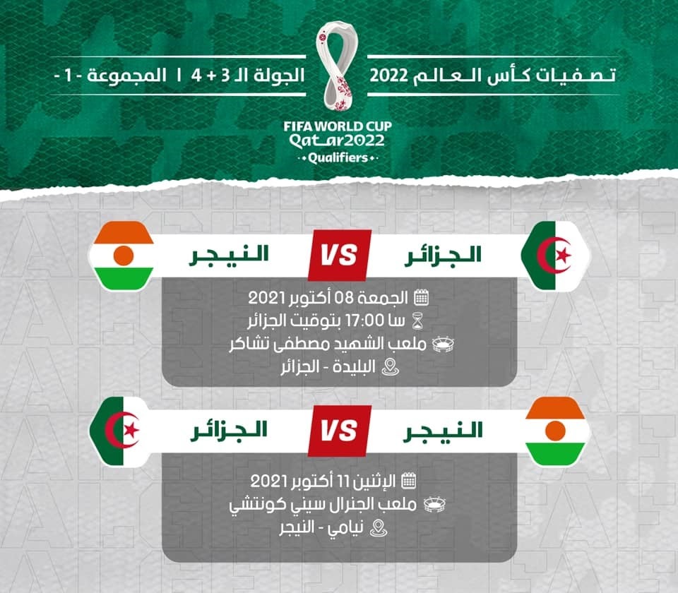 ستجرى المواجهة المزدوجة بين منتخبي الجزائر والنيجر برسم الجولتين الثالثة والرابعة عن المجموعة الأولى من التصفيات المؤهلة الى كأس العالم 2022، يومي 8 و11 أكتوبر المقبلين حسبما أعلنته السبت الاتحادية الجزائرية لكرة القدم.