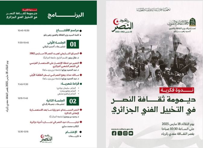 في إطار الاحتفال بذكرى عيد النصر 19 مارس 1962، الذي يمثل نقطة فاصلة في تاريخ الجزائر، تُنظم وزارة الثقافة والفنون وبإشرافٍ من السيد الوزير “زهير بللو”، ندوة فكرية تحت عنوان “تجليات عيد النصر في التخييل الأدبي والفني الجزائري”.
