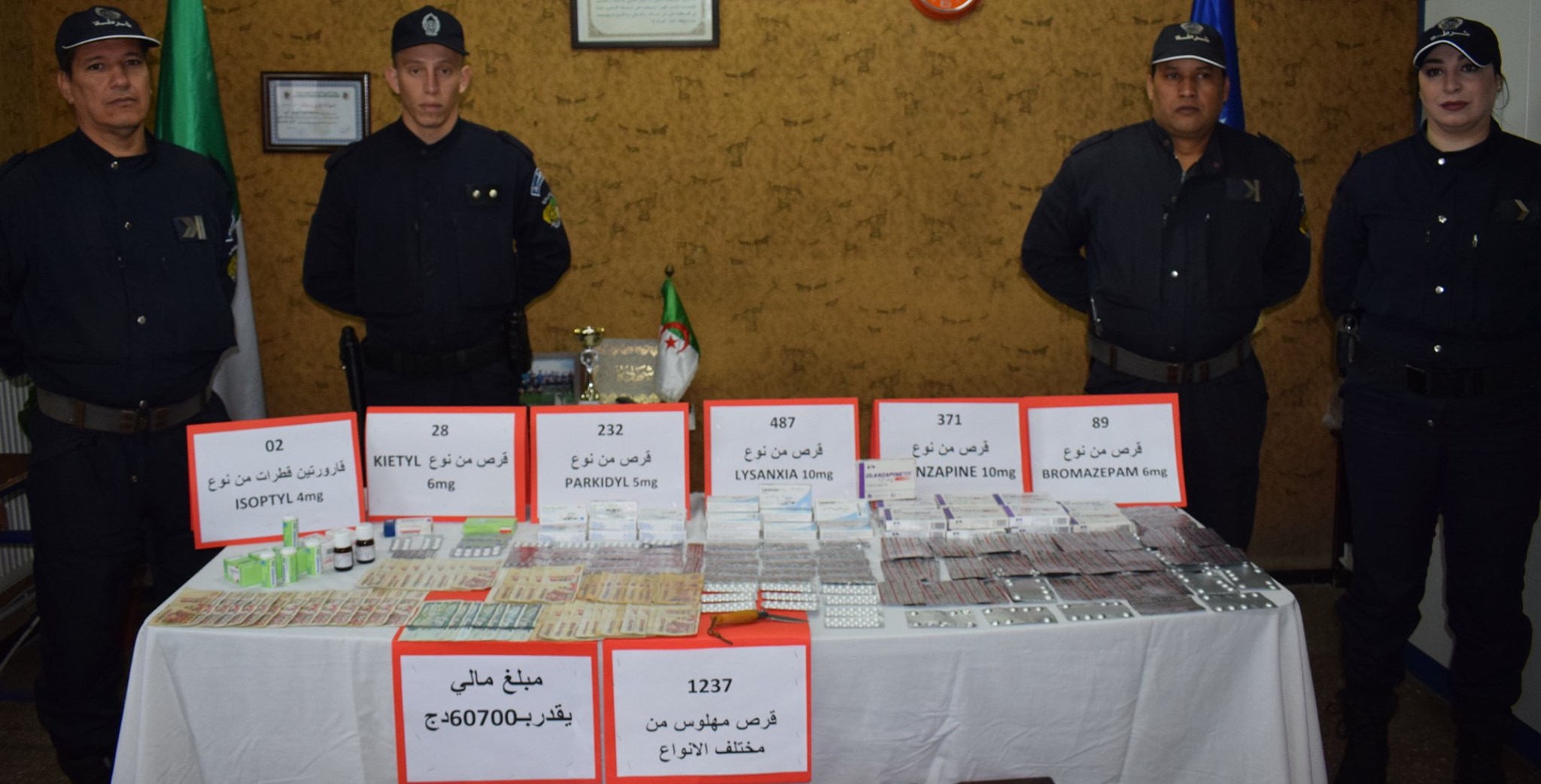 تواصل مصالح أمن ولاية عنابة عملياتها النوعية، في إطار محاربة الجريمة في الأوساط الحضرية، حيث تمكنت قوات الشرطة للأمن الحضري السابع ووفقا لعمل استعلاماتي وخطة محكمة و مدروسة من توقيف مسبوق قضائيا يبلغ من العمر 52 سنة ، مشتبه فيه في ترويج المؤثرات العقلية، احترافية قوات الشرطة مكنت من حجز كمية معتبرة من الأقراص المهلوسة المقدرة بـ 1237 قرص مهلوس من مختلف الأنواع ، قارورتي سائل مخدر، سلاح أبيض محظور، إضافة إلى مبلغ مالي معتبر من عائدات الترويج. كما تمكنت قوات الشرطة من توقيف شركائه المقدر عددهم ب 3 أشخاص. للإشارة تم اتخاذ كافة الإجراءات القانونية اللازمة في حق المشتبه فيهم.