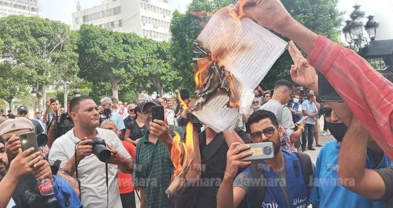 أثار قيام عدد من المؤيدين للرئيس قيس سعيد بتمزيق الدستور التونسي وحرقه موجة استنكار واسعة في تونس، دفعت البعض للدعوة لمحاكمتهم بتهمة الخيانة، فيما دعا آخرون لتنظيم تظاهرات تطالب بعزل الرئيس بتهمة “تجييشه للشارع للتونسي”، محذرين من حدوث مصادمات قد تؤدي لأحداث عنف كبيرة في البلاد.