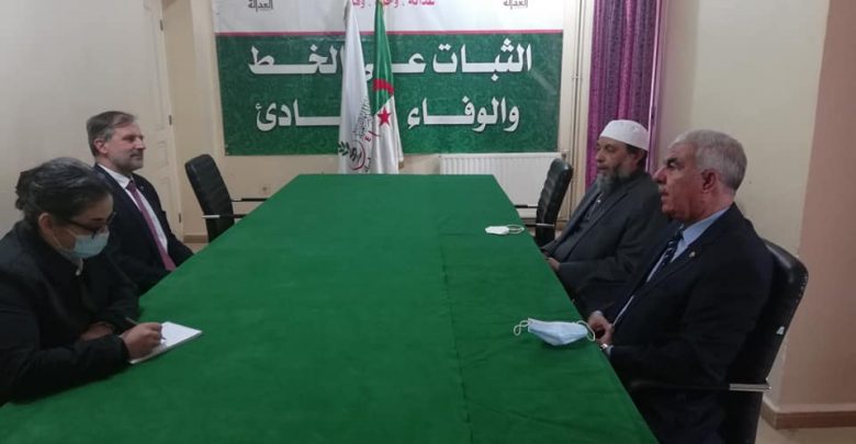 استقبل رئيس جبهة العدالة والتنمية، عبد الله جاب الله، اليوم، سفير الاتحاد الأوروبي بالجزائر، بمقر الحزب، ببابا حسن غرب العاصمة.