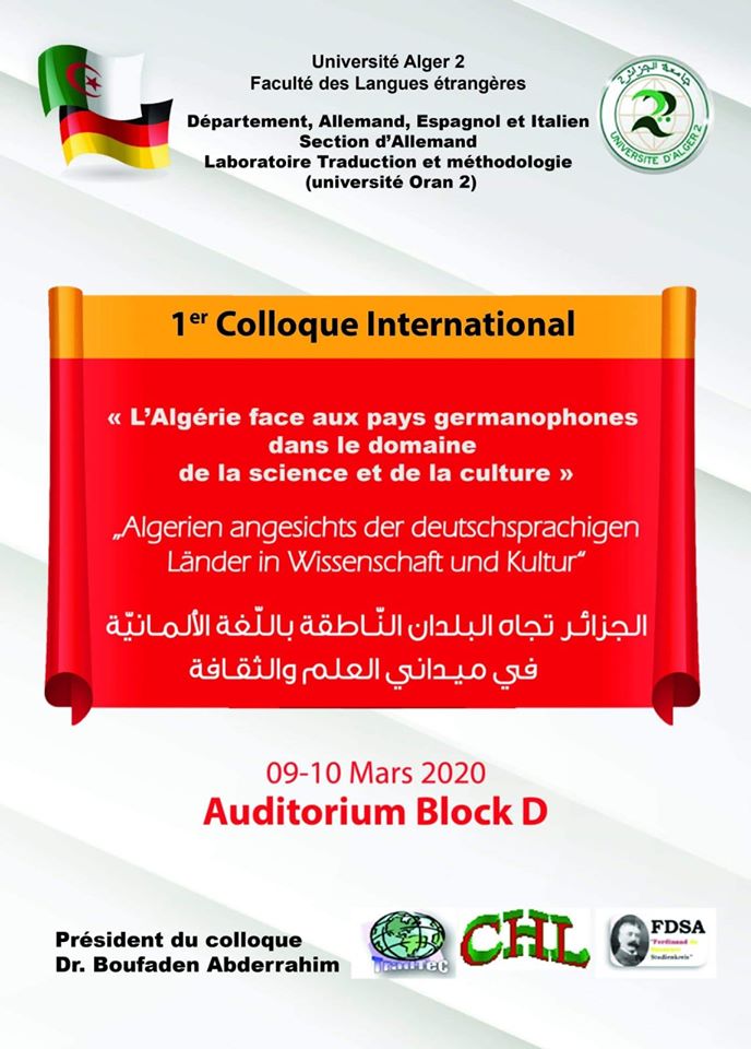 تنظم كلية اللغات الأجنبية قسم الألمانية بجامعة الجزائر 2 أبو القاسم سعد الله، وتحت رئاسة الأستاذ عبد الرحيم بوفادن وإشراف العميد ابراهيم منصوري، وبالتعاون مع مخبر الترجمة والمنهجية بجامعة وهران 2، الملتقى الدولي الأول حول “الجزائر تجاه البلدان الناطقة باللغة الألمانية في ميداني العلم والثقافة”، وذلك يومي 9 و10 مارس الجاري، بمشاركة أساتذة من داخل وخارج الوطن.