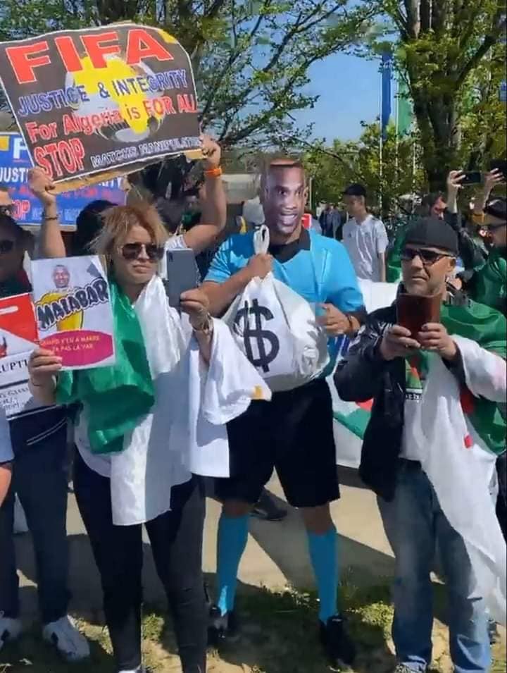 ورفع المحتجون صورا للحكم الغامبي واتهموه بتلقي رشاوي من رئيس الاتحاد الكاميروني، صاموئيل إيتو، في محاولة للضغط على الهيئة الكروية العالمية التي من المقرر أن تعلن قرارها بخصوص الطعن الجزائري، الخميس.
