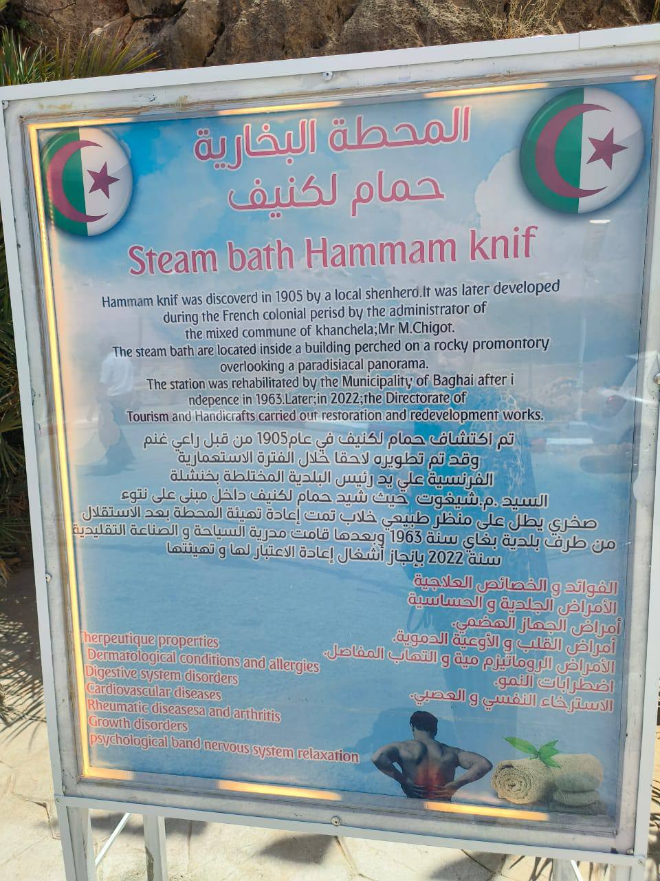 وأضاف بأن إعادة فتح هذه المحطة البخارية جاء عقب أشغال إعادة تهيئة شملت إعادة بناء بعض الجدران وسقف البناية وإعادة تأهيل غرف الحمام والغرفتين اللتين تحتويان على فوهات بركانية تنفث بخار الماء الساخن الذي يخرج من باطن الأرض وذلك بغلاف مالي فاق 87 مليون دج ضمن البرنامج التكميلي للتنمية الذي استفادت منه الولاية.
