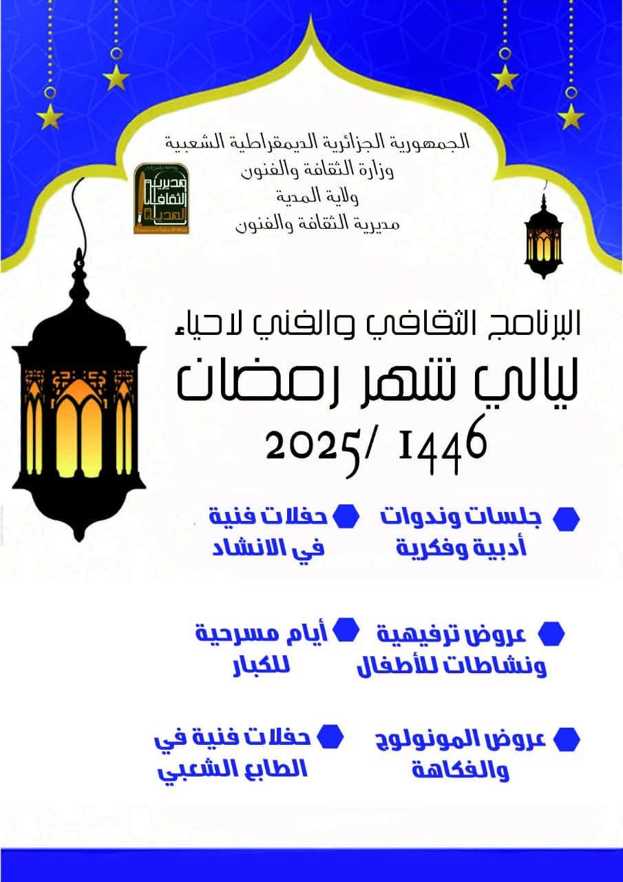 سطرت مديرية الثقافة والفنون بالتنسيق مع المؤسسات الثقافية تحت الوصاية؛ الجمعيات الثقافية ؛ وعدد من الشركاء والفواعل الثقافيين برنامج ثقافي وفني شامل ومتنوع يمتد على مدار الشهر الكريم يراعي ويلبي اذواق كافة الشرائح والفئات العمرية ويتناسب وخصوصية الشهر الفضيل.