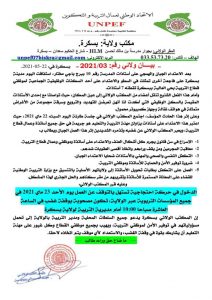 كما تقرر الدخول في حركة احتجاجية، تستهل بالتوقف عن العمل، يوم الأحد 23 ماي، في جميع المؤسسات التربية عبر الولاية، وستكون مرفوقة بوقفة غضب في الساعة العاشرة، أمام مديرية التربية لولاية بسكرة.