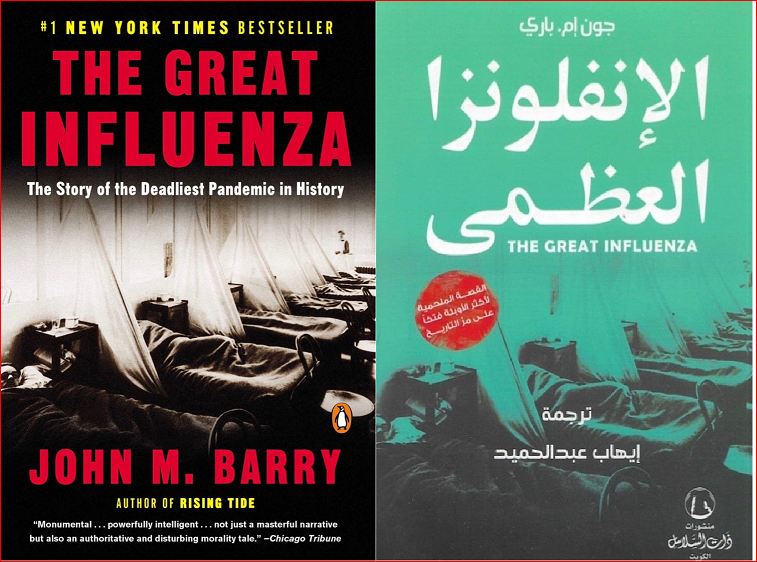 من الكتب التى صدرت حديثا عن دار ذات السلاسل فى الكويت كتاب (الانفلونزا العظمى) للكاتب (جون م. باري)، بترجمة إيهاب عبد الحميد، والكتاب يتحدث عن جائحة “الإنفلونزا الإسبانية” عام 1918 والتى أصابت عدواها ما يقارب 500 مليون شخص قتل منهم 50-100 مليون حول العالم، ونشرت صفحة Moteb F. Alshammary على موقع التواصل الاجتماعى “تويتر” أغلفة الكتاب العربى والأجنببى، والمعروف أن “جون إم. باري” كاتب ومؤرخ أمريكى معاصر اختارته إدارتا جورج دبليو. بوش وباراك أوباما للمشاركة فى استراتيجيات مكافحة الأوبئة بالولايات المتحدة.