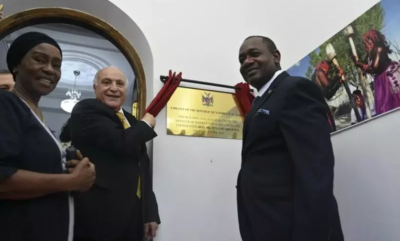 أشرف أحمد عطاف، وزير الدولة وزير الشؤون الخارجية والجالية الوطنية بالخارج والشؤون الأفريقية رفقة نظيره الناميبي،بيا موشيلنجا، وزير العلاقات الدولية والتعاون، على مراسم تدشين مقر سفارة جمهورية نامبيا، اليوم بالجزائر العاصمة.
