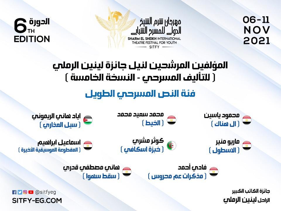كشف مهرجان شرم الشيخ الدولي للمسرح الشبابي، عن قائمة أسماء المؤلفين المرشحين لنيل جائزة “لينين الرملي” في التأليف المسرحي في دورتها الخامسة والتي ستنظم على هامش الدورة السادسة من المهرجان، والتي ضمت اسم المؤلفة الجزائرية كوثر مشرى عن نصها “خبزة إسكافي” في فئة النصوص المسرحية الطويلة، والمؤلف وليد عبد الألهي عن نصه “رغبة جمراء” في فئة النص المسرحي القصير.
