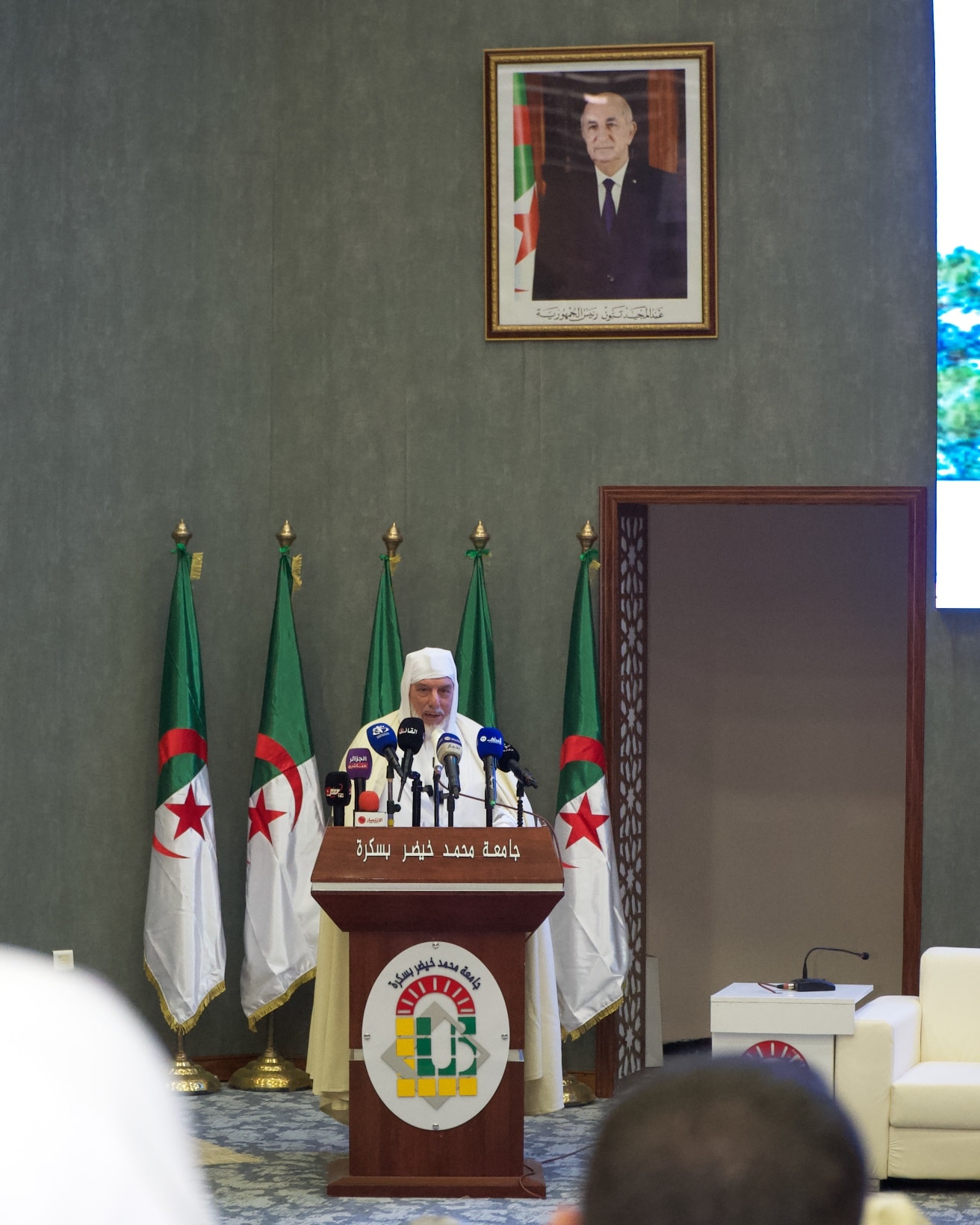 وفي ختام الجلسة، كرّمت جامعة محمد خيضر ببسكرة السيّدَ العميد تقديرًا لإسهامه الفكريّ في إنجاح الملتقى، وتثمينا لجهوده في صون اللغة العربية، والدفاع عن مرجعيّة الجزائر الدينية الجامعة.