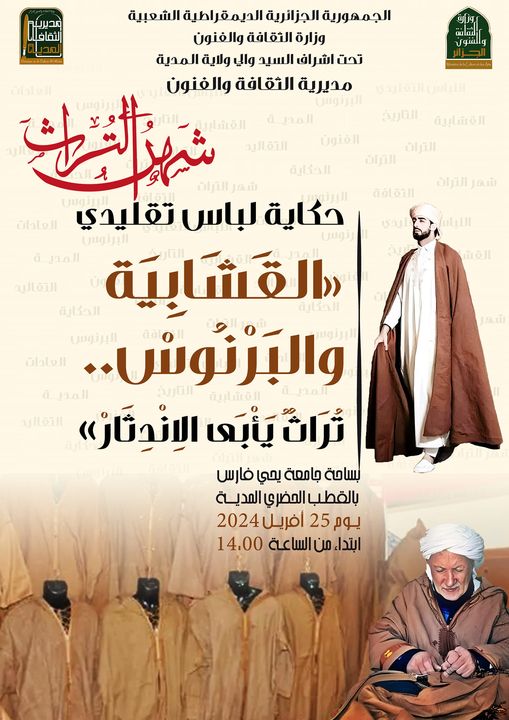 تنظم هذا الخميس عاصمة التيطري المدية ، تظاهرة تراثية تعنى باللباس التقليدي المحلي تحت شعار “القشابية والبرنوس تراث يٱبى الاندثار”، ذلك في إطار البرنامج الثقافي والفني الخاص بشهر التراث الثقافي لسنة 2024 الموسوم بشعار “التراث الثقافي وإدارة الأزمات في ضل المخاطر والكوارث الطبيعية”.