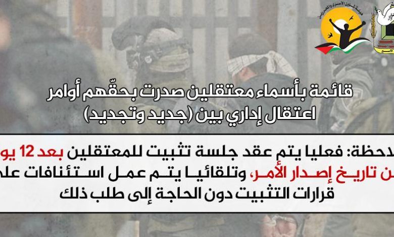 قائمة بأسماء 82 معتقلا بينهم أسيرة أصدر الاحتلال بحقهم أوامر اعتقال إداري بين أوامر جديدة وأوامر تجديد