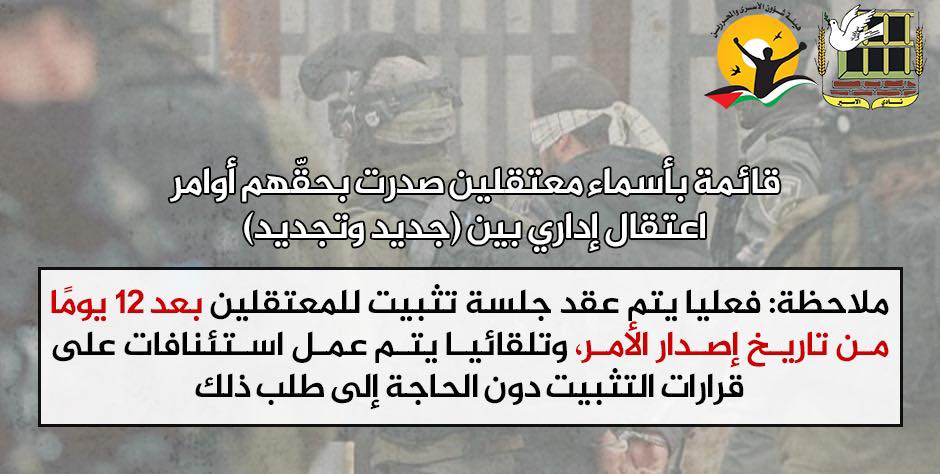 قائمة بأسماء 82 معتقلا بينهم أسيرة أصدر الاحتلال بحقهم أوامر اعتقال إداري بين أوامر جديدة وأوامر تجديد