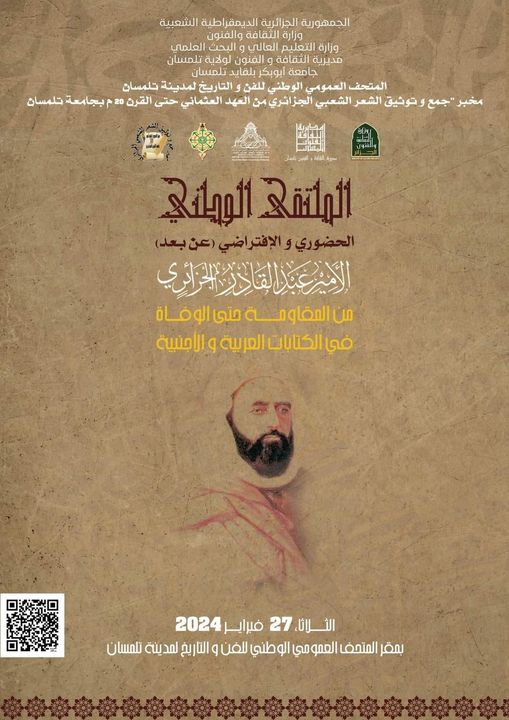 يحتضن اليوم المتحف العمومي الوطني للفن والتاريخ بتلمسان فعاليات ملتقى وطني بعنوان الأمير عبد القادر الجزائري من المقاومة حتى الوفاة في الكتابات العربية والأجنبية.