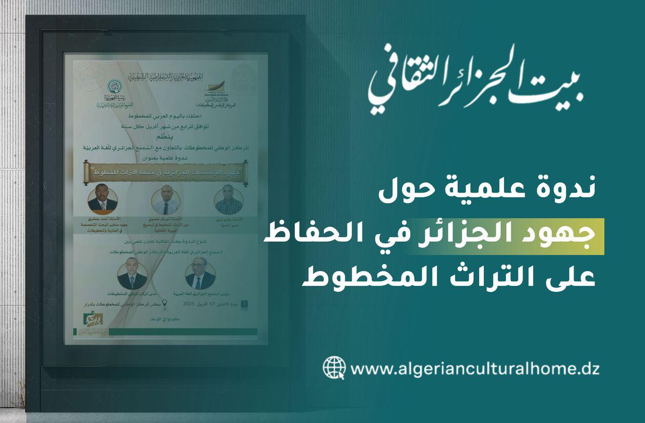 ينظم المركز الوطني للمخطوطات، بالتعاون مع المجمع الجزائري للغة العربية، ندوة علمية بعنوان “جهود المؤسسات الجزائرية في الحفاظ على التراث المخطوط”، وذلك اليوم الاثنين بمقر المركز الوطني للمخطوطات.