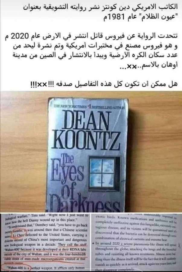 منذ ايام ينتشر غلاف كتاب “عيون الظلام” لدين كونتز على صفحات وحسابات على وسائل التواصل الاجتماعي، لاسيما في تويتر (هنا، هنا، هنا، هنا، هنا، هنا…)، وفيسبوك (هنا، هنا، هنا…). وفي المزاعم المرفقة، “الكاتب الاميركي دين كونتز نشر روايته التشويقيه بعنوان عيون الظلام عام 1981، وهي تتحدث عما يحصل اليوم عام 2020″، وايضا عيون الظلام “اسم رواية خيالية للكاتب دين كونتز كتبها عام 1981، وتنبأ فيها بالفيروس المنتشر هذه الايام والمدينة التي أنتج فيها، وهي ووهان الصينية في مختبر عسكري كسلاح بيولوجي…”.