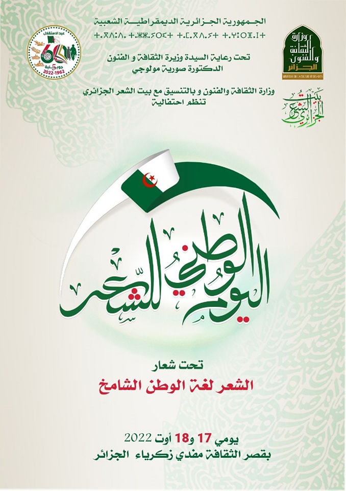 تنظم وزارة الثقافة والفنون، بالتنسيق مع بيت الشعر الجزائري يومي 17 و 18 أوت الجاري، تظاهرة أدبية تحت شعار “الشعر لغة الوطن” و ذلك بمناسبة احياء اليوم الوطني للشعر.