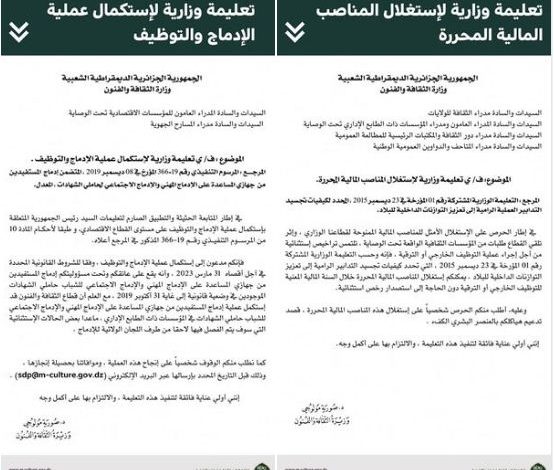 وجاء في تعليمة وزيرة الثقافة “في إطار الحرص على الاستغلال الأمثل للمناصب المالية الممنوحة لقطاعنا الوزاري، وإثر تلقي القطاع طلبات من المؤسسات الثقافية الواقعة تحت الوصاية، تلتمس تراخيص استثنائية من أجل إجراء عملية التوظيف الخارجي أو الترقية، فإنه وحسب التعليمة الوزارية المشتركة رقم 01 المؤرخة في 23 ديسمبر 2015، التي تحدد كيفيات تجسيد التدابير الرامية إلى تعزيز التوازنات الداخلية للبلاد، يمكنكم استغلال المناصب المالية المحررة خلال السنة المالية المعنية للتوظيف الخارجي أو الترقية دون الحاجة إلى استصدار رخص استثنائية. وعليه، أطلب منكم الحرص شخصياً على استغلال هذه المناصب المالية المحررة، قصد تدعيم هياكلكم بالعنصر البشري الكفء إنني أولي عناية فائقة لتنفيذ هذه التعليمة ، والالتزام بها على أكمل وجه”.