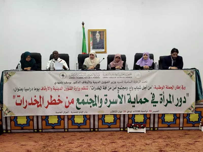 نظمت وزارة الشؤون الدينية والأوقاف يوم الخميس بالجزائر العاصمة يوما دراسيا خصص لموضوع دور المرأة في حماية الأسرة والمجتمع من مخاطر المخدرات وذلك في إطار الحملة الوطنية التي أطلقتها الوزارة تحت شعار من أجل شباب واع ومجتمع آمن من آفة المخدرات