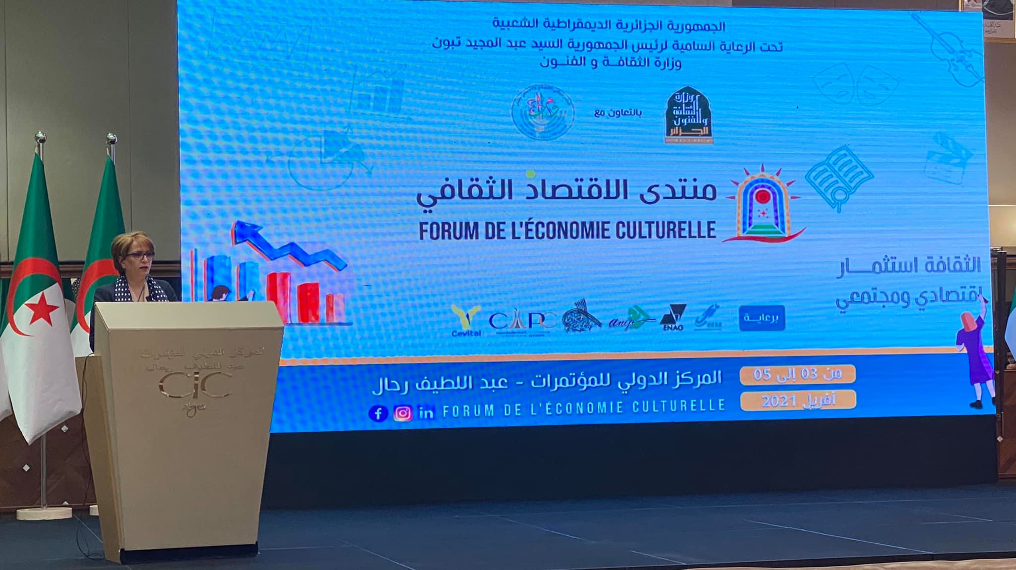 وأكدت بخصوص المنتدى بأنه رهان، على كفاءة وعبقرية العقل الجزائري ليطور أشكال وأسباب ممارسة الثقافة في الاقتصاد الوطني.