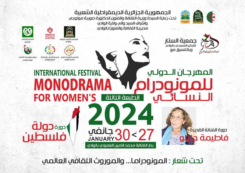 عمل يقدم عرضه الأول على خشبة دار الثقافة محمد الأمين العمودي لولاية الوادى، وعليها ستجري فعاليات المهرجان من عروض، ورشات تكوينية، وتكريمات، شعاره فيها “المونودراما… والموروث الثقافي العالمي”، وفلسطين ضيف شرف هذه الطبعة التي تم تأجيلها من نوفمبر إلى غاية نهاية جانفي بسبب الاعتداءات الصهيونية على دولة فلسطين وتحديدا على قطاع غزة من مجازر رهيبة يتعرض لها شعب فلسطين الأعزل وما تخلفه يوميا من أعداد مهولة من الشهداء من مختلف الأعمار.