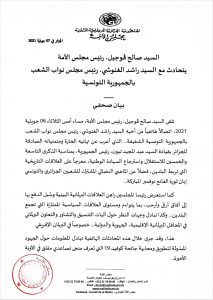 تلقى رئيس مجلس الأمة، صالح ڨوجيل، مساء أمس الثلاثاء، اتصالاً هاتفياً، من رئيس مجلس نواب الشعب بالجمهورية التونسية الشقيقة، راشد الغنوشي.