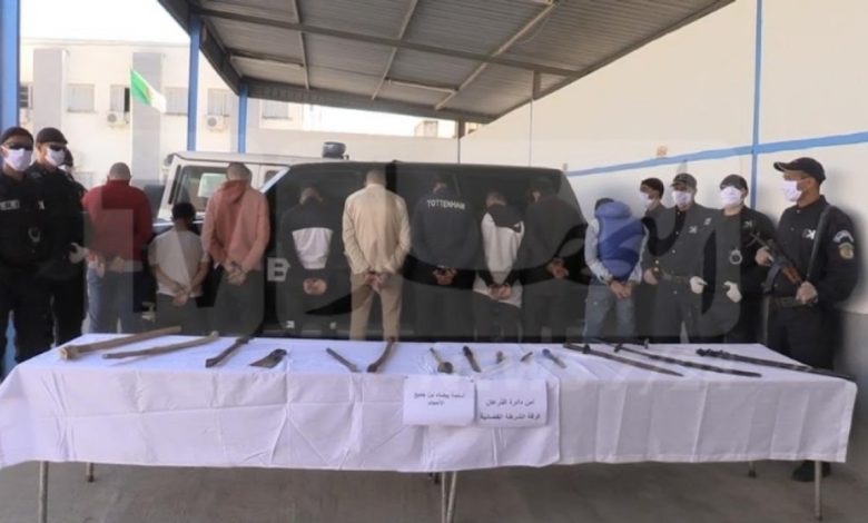 وأفضت إجراءات البحث والتحري إلى توقيف المتسببين والمقدر عددهم بـ 11 شخصا مشتبه فيهم مع ضبط واسترجاع أداة الجريمة ومجموعة من الأسلحة البيضاء المستعملة في المشاجرة والمقدر عددها ب29 سلاحا أبيضا منها بندقية صيد بحرية و سيوف تقليدية الصنع و سكاكين من الحجم الكبير و المتوسط و الصغير وعصا خشبية, وفقا لخلية الاتصال.