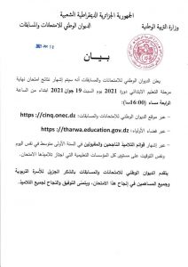 وحسب الديوان الوطني للإمتحانات والمسابقات، سيتم الإعلان عن نتائج السانكيام يوم السبت 19 جوان ،2021 بداية من الساعة الرابعة مساءا. وأوضح الديوان في بيانه ان إعلان النتائج سيكون عبر موقع: cinq.onec.dz